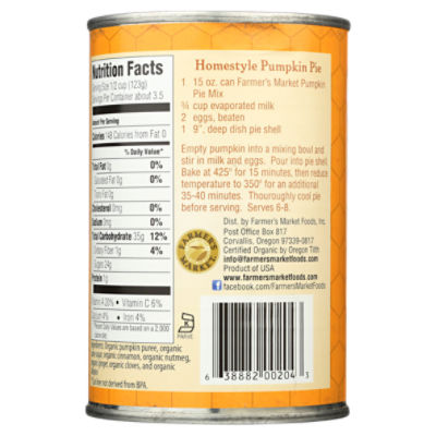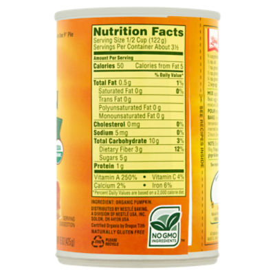 Nutritional facts for Pumpkin purée, unsweetened, … Nutritional data per cup (200 grams) Net carbs 10.4 grams. Protein 2.2 grams. Fat 0.6 grams. Calories 68 kcal. Total carbs 16.2 grams Fiber 5.8 grams Sugars 6.6 grams Saturated fat 0.3 … Pumpkin, canned, without salt Nutrition Facts & Calories - Self It is also a good source of Vitamin E (Alpha Tocopherol), Pantothenic Acid, Magnesium, Phosphorus, Potassium and Copper, and a very good source of Dietary Fiber, Vitamin A, Vitamin C, Vitamin K, Iron and Manganese. The bad: A large portion of the calories in this food come from sugars. Caloric Ratio Pyramid. Caloric Ratio Pyramid for Pumpkin ... Pumpkin Puree, 15 oz at Whole Foods Market Find 365 by Whole Foods Market Pumpkin Puree, 15 oz at Whole Foods Market. Get nutrition, ingredient, allergen, pricing and weekly sale information! ... Nutrition Facts. 3.5 servings per container. Serving size. 120 g (120 g) Amount per serving. Calories. 40 % Daily Value * Total Fat 0g. 0%. Sat Fat 0g. 0%. Trans Fat 0g. Cholesterol 0mg. 0%. Pumpkin: Nutrition, Benefits, and How to Eat It - Healthline It's nutrient dense, meaning it has lots of vitamins and minerals and relatively few calories. One cup (245 grams) of canned pumpkin provides ( 1 ): Calories: 137. Protein: 3 grams. Fat: 7 grams ...