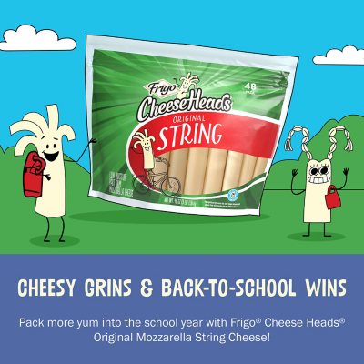 Light String Cheese | Frigo® Cheese Heads® Frigo ® Cheese Heads ® Light String Cheese has 7 grams of protein and only 50 calories. Creamy & delicious, stringy & fun it's the perfect snack for your family on-the-go! Available in packs of 3, 12, 16, 24 and 36.