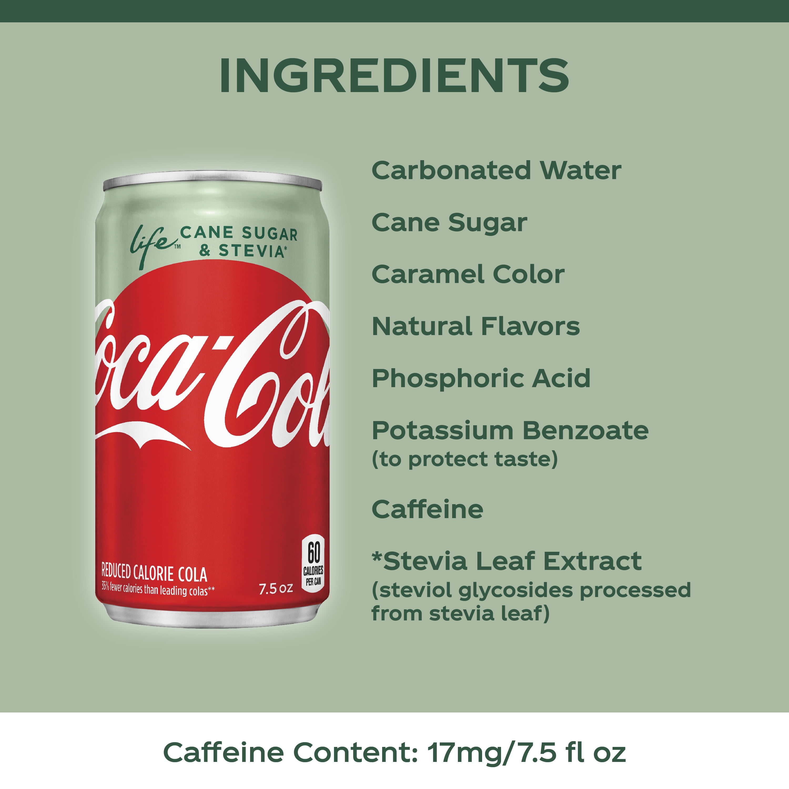 Coca-Cola Life Soda Soft Drink, 12 fl oz, 12 Pack - Walmart.com A refreshing and crisp taste of Coca-Cola, with 35% fewer calories than leading colas*. Sweetened with cane sugar and stevia leaf extract. 28 mg of caffeine in each 12 oz serving. 12 FL OZ in each can. This sparkling beverage is best enjoyed ice-cold for maximum refreshment.