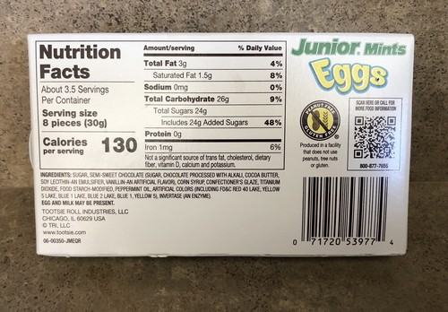 Junior mints nutrition info. Join LiveJournal Password requirements: 6 to 30 characters long; ASCII characters only (characters found on a standard US keyboard); must contain at least 4 different symbols; Calories in Junior Mints Junior Mints Deluxe and Nutrition Facts There are 190 calories in 3 pieces (43 g) of Junior Mints Junior Mints Deluxe. Calorie breakdown: 40% fat , 59% carbs, 2% protein. Related Candies from Junior Mints: Calories in Junior Mints Junior Mints and Nutrition Facts - FatSecret There are 130 calories in 12 pieces (30 g) of Junior Mints Junior Mints. Calorie breakdown: 18% fat , 82% carbs, 0% protein. Related Candies from Junior Mints: Junior Mints Nutrition Facts & Calories - inlivo.com NUTRITION FACTS (% of daily value based on 2000 calories per day) Protein. Carbs. Fiber. Fat. Saturated Fat. Cholesterol. Sodium. Added Sugar. HOW TO BURN THOSE CALORIES. ... Nutrition Facts. Junior Mints. Serving Size: piece (43g) * Amount Per Serving ; Calories: 157.4 cal : Calories from Fat: 36 cal % Daily Value : Total Fat: 4 g : 6.2% ...