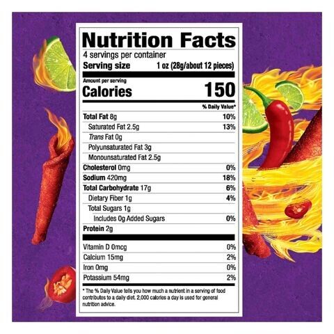 Takis Tortilla Chips, Fuego, Hoy Chili Pepper & Lime: Calories ... Nutrition Serving Size: 1 oz (28g/about 12 pieces) Amount per Serving My Daily Value Calories 150 Kcal 9% Total Fat 8 g 13% Saturated Fat 2.5 g 15% Trans Fat 0 g 0% Cholesterol 0 mg 0% Sodium 420 mg 18% Potassium 54 mg 1% Total Carbohydrate 17 g 7% Dietary Fiber 1 g 4% Sugars 1 g 1% Added Sugars 0 g 0% Protein 2 g 4% Calcium 26 mg 3% Iron 0 mg 0%