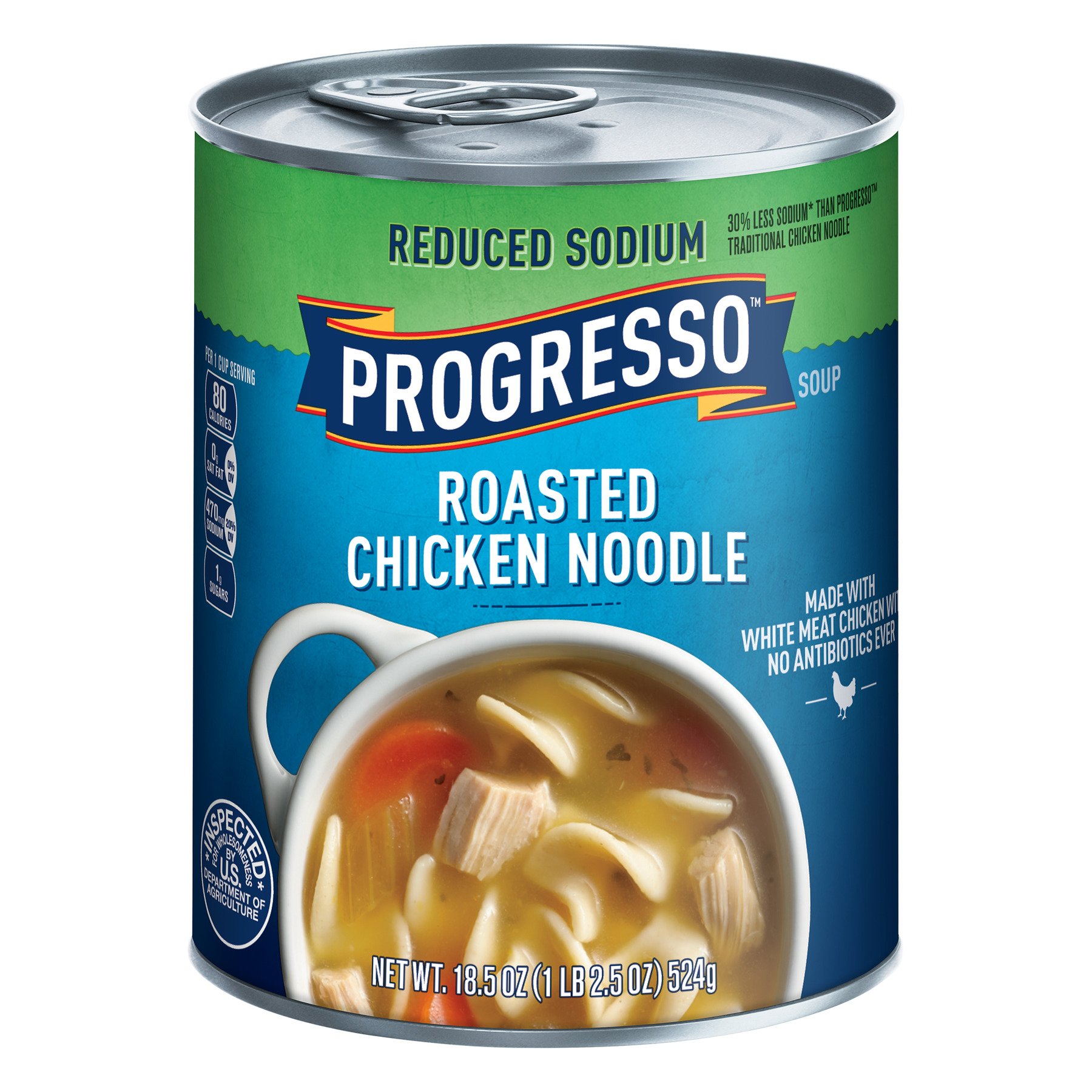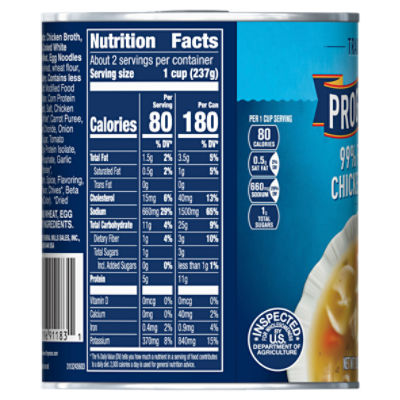 Traditional Chicken Noodle | Canned Soup | Progresso Contains: egg, soy, wheat Low Fat No Artificial Flavors No Colors From Artificial Sources Made with White Meat Chicken with No Antibiotics Ever 110 Cals per Serving Ingredients Contains: egg, soy, wheat Nutrition Facts 2 servings per container Serving Size 1 cup (242g) Ingredients, nutrition facts, and allergen statements can change.