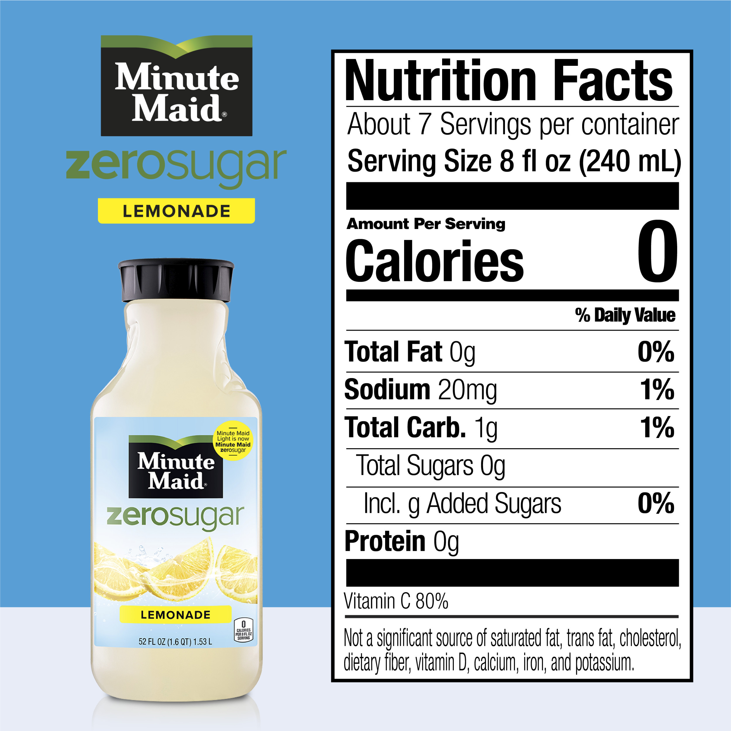 Zero Sugar Lemonade - Low Sugar Juice | Minute Maid® Give your taste buds something to smile about with Minute Maid® Zero Sugar Lemonade. It’s the great taste you know and love, with zero grams of sugar per serving. ... VIEW NUTRITION FACTS. Details. 0 calories per 8 fl oz serving. Pasteurized. ... checkbox label label. Apply Cancel. Consent Leg.Interest. Switch Label label. Switch Label label ... Zero Sugar Mango Passion - Low Sugar Juice | Minute Maid® Take your taste buds on a tropical vacation with Minute Maid® Zero Sugar Mango Passion. ... ZERO SUGAR PINK LEMONADE . ZERO SUGAR FRUIT PUNCH . ZERO SUGAR LEMONADE . LIGHT CHERRY LIMEADE ... VIEW NUTRITION FACTS. Details. 5 calories per 8 fl oz serving. Pasteurized. Excellent source of vitamin C. Minute Maid Light is now Minute Maid Zero Sugar ... Minute Maid Fruit Punch, Made w/ Real Fruit Juice, 59 fl oz Minute Maid Strawberry Lemonade, Fruit Drink, 59 fl oz. Add. $1.68. ... Nutrition facts. Refer to the product label for full dietary information, ... And Minute Maid fruit drinks and juices carry on the tradition of good.All our punches are filled with flavors that tickle your taste buds and have you ready for your next glass.
