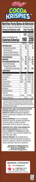 Kellogg's® Cocoa Krispies® cereal - SmartLabel™ Rice Krispies® Kellogg's® Cocoa Krispies® cereal. 22.4 oz. 00038000198618. Nutrition . Ingredients . Allergens . Features & Benefits ... Calories 150 220 Kellogg's® Cocoa Krispies® cereal - SmartLabel™ Kellogg's® Cocoa Krispies® cereal. 15.5 oz. 00038000198595. Nutrition . Ingredients . Allergens . Features & Benefits . ... Calories 160 220 % Daily Value* % DV * Cocoa Krispies® Cereal | Rice Krispies® Nutrition Ingredients Ingredients: Rice, sugar, cocoa, maltodextrin, contains 2% or less of malt flavor, iodized salt (salt, potassium iodate), palm kernel oil, natural and artificial flavor, red 40, yellow 6, blue 1, BHT for freshness.