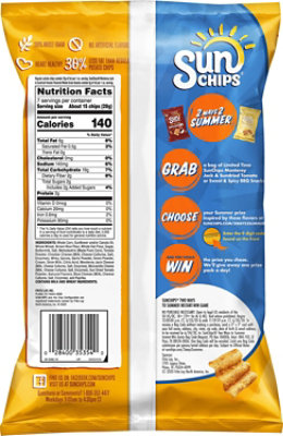 SUNCHIPS® Original Whole Grain Snacks | FritoLay SUNCHIPS ® snacks are wavy, ripple-y squares full of whole-grain goodness (14-19g of whole grains per serving). Grab a bag of SUNCHIPS ® whole grain snacks in your favorite flavor, and tell your taste buds to meet you at the corner of delicious and wholesome. Buy Online Nutrition Facts Facebook