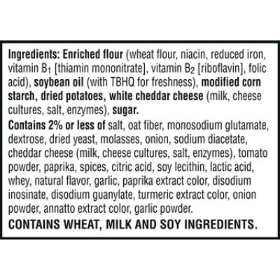 Cheez its ingredients label. Official US Nutrition Label Information Cheez It Made with 9g... Kellogg's Cheez-It Product Name: Cheez-It Made with 9g Whole Grain for Schools Serving Size: 1 Pouch (21g) First Ingredient: Whole wheat flour Your whole grain product meets all nutrient standards for entrees or snack foods. Calories from Fat NA Nutrition Facts Serving Size 21.00 g Servings Per Container Amount Per Serving Calories 100 Official Nutrition Label Information Cheez It made with 9g Whole... Official Nutrition Label Information Cheez It made with 9g Whole Grain Kellogg Company - Proprietary Flavor Descriptor NLI Description Brand Serving Size Serving Size g Serving Size oz Calories Calories from Fat Total Fat 3.5 g 5 % g % Saturated Fat 1 g 5 % g % Trans Fat 0 g g Polyunsaturated Fat 1.5 g g Monounsaturated Fat 0.5 g g Cholesterol ... Official Nutrition Label Information Cheez-It made with Whole... 1 Package Ingredients: 21 WHOLE WHEAT FLOUR, ENRICHED FLOUR (WHEAT FLOUR, NIACIN, REDUCED IRON, VITAMIN B1 [THIAMIN MONONITRATE], VITAMIN B2 [RIBOFLAVIN], FOLIC ACID), WHITE CHEDDAR CHEESE (MILK, CHEESE CULTURES, SALT, ENZYMES), SOYBEAN OIL WITH TBHQ FOR FRESHNESS, CONTAINS TWO PERCENT OR LESS OF SALT, CALCIUM Cheez-It® Products | Cheez-It® Baked Snack Crackers CHEEZ-IT ® BAKED SNACK CRACKERS Cheesy, Crunchy, Satisfaction. view all crackers Cheez-It ® Puff'd™ Defy your CHEEZpectations!™ view all Puff'd™ CHEEZ-IT ® SNAP'D ® Thin and Crispy baked snacks with big cheese taste inside and out. view all Snap'd® CHEEZ-IT ® GROOVES ® Bold Flavor, Big Crunch. view all Grooves® CHEEZ-IT DUOZ ®