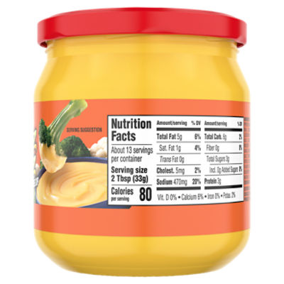 Calories in Kraft Cheez Whiz Cheese Dip Original and Nutrition Facts Cheez Whiz Cheese Dip Original Nutrition Facts Serving Size 2 tbsp (33 g) Amount Per Serving Calories 80 % Daily Values* Total Fat 5.00g 6% Saturated Fat 3.000g 15% Trans Fat 0.200g Cholesterol 20mg 7% Sodium 420mg 18% Total Carbohydrate 6.00g 2% Dietary Fiber 0.0g 0% Sugars 4.00g Protein 3.00g Vitamin D - Calcium - Iron - Potassium -