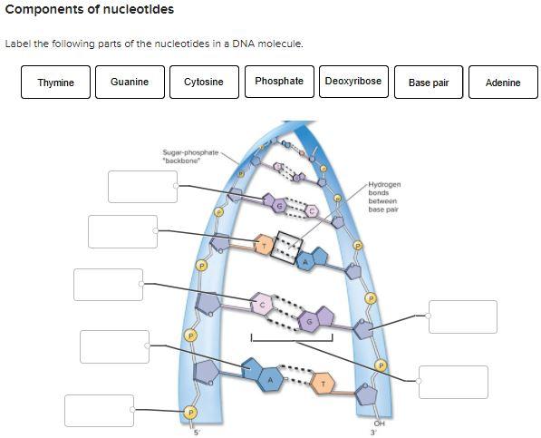 What are the Three Parts of a Nucleotide? Nucleotides are made up of 3 parts. The first is a distinct nitrogenous base, which is adenine, cytosine, guanine or thymine. In RNA, thymine is replaced by uracil. These nitrogenous bases are either purines or pyrimidines. Base pairs are formed when adenine forms a hydrogen bond with thymine, or cytosine forms a hydrogen bond with guanine. DNA structure and replication review Nucleotide: Building block of nucleic acids: Double helix: Structure of two strands, intertwining around an axis like a twisted ladder: DNA replication: Process during which a double-stranded DNA molecule is copied to produce two identical DNA molecules: Base pairing: Principle in which the nitrogenous bases of the DNA molecules bond with one ... What Are the Three Main Parts of a Nucleotide? Three Parts of Nucleotide. The sugar component of the nucleotides is a five-carbon sugar. Deoxyribose or 2-deoxyribose is the five-carbon sugar that is found in DNA, whereas ribose is found in RNA. The primary difference between the two sugars is the replacement of hydroxyl group by hydrogen at the 2' position in deoxyribose. The sugars are ... Nucleic Acids Flashcards - Base implies one of the nitrogenous bases ( adenine, guanine, cytosine, thymine). - One nucleotide is composed of a base, a deoxyribose sugar, and a phosphate. - There are four types of nucleotides because there are four types of bases. Explain how the structure of DNA is important to its function as an information storage molecule.